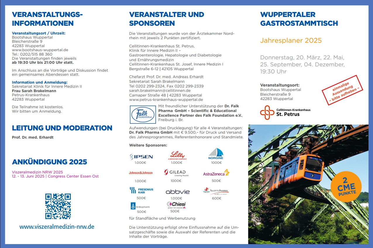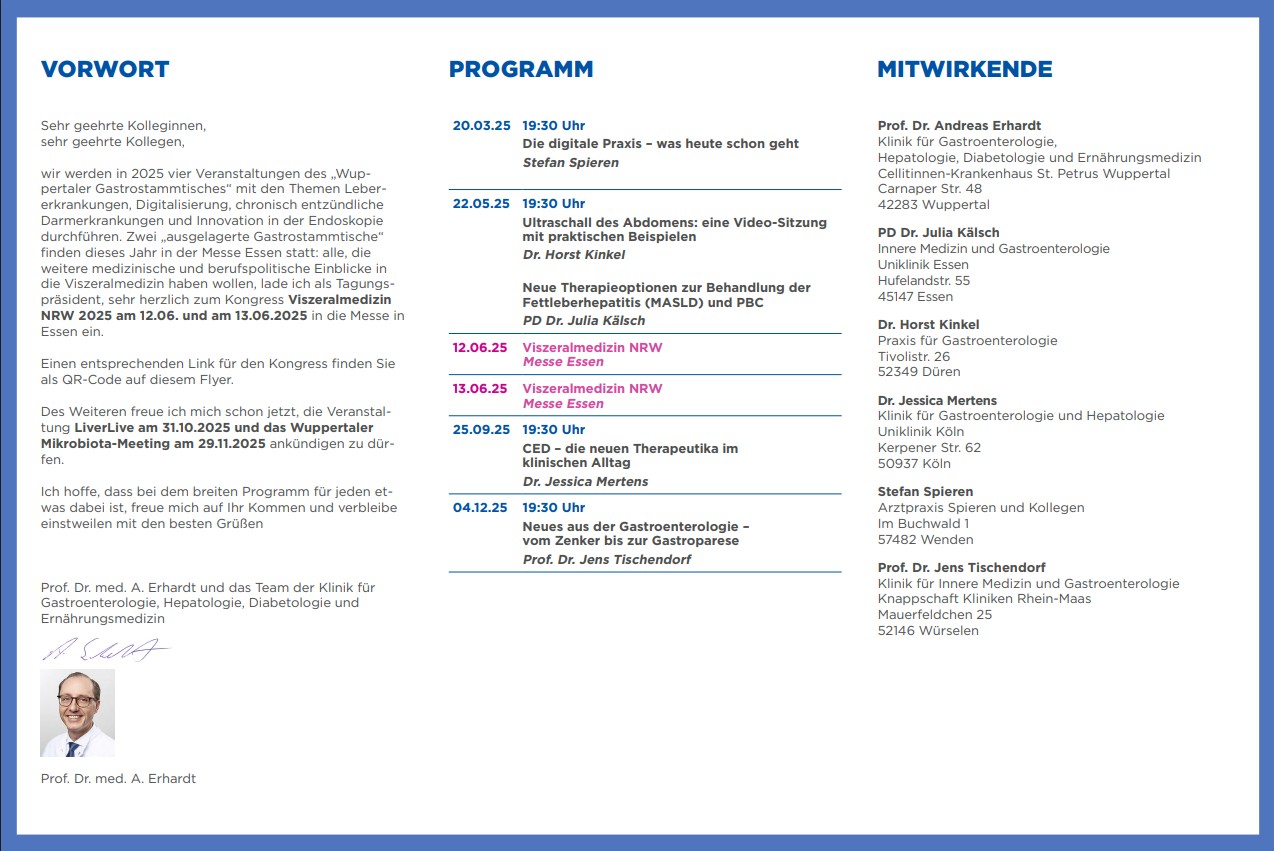 wir werden in 2025 vier Veranstaltungen des „Wuppertaler Gastrostammtisches“ mit den Themen Lebererkrankungen, Digitalisierung, chronisch entzündliche Darmerkrankungen und Innovation in der Endoskopie durchführen.