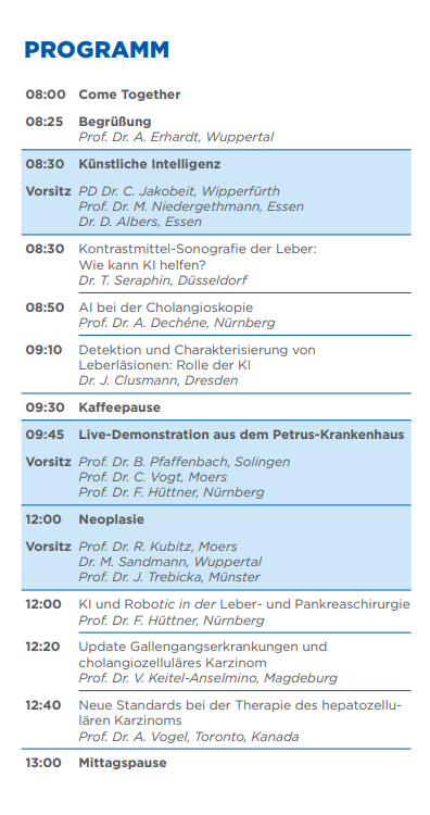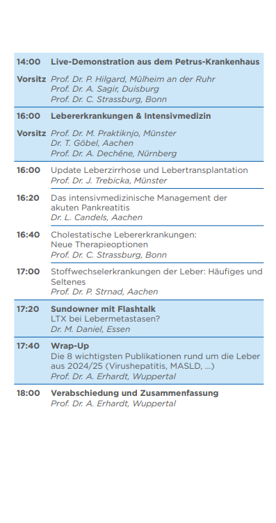 Lebererkrankungen stellen eine weltweite Herausforderung dar. Neben den viralen Hepatitiden rücken zunehmend die metabolisch assoziierten Lebererkrankungen in den Vordergrund. Die Inzidenz der hepatozellulären als auch cholangiozellulären Karzinome ist in den letzten Jahrzehnten deutlich gestiegen. Dem gegenüber stehen neue Therapieoptionen bei den cholestatischen Lebererkrankungen, bei der MASLD und zunehmend personalisierte Therapien beim HCC, aber insbesondere beim CCC. KI spielt eine zunehmende Rolle, sowohl in der Diagnostik, aber auch in therapeutisch-operativem Setting. All diesen Entwicklungen wollen wir mit den LiverLive Symposium Rechnung tragen. Wie immer wird der Schwerpunkt des Symposiums jedoch auf den Live-Demonstrationen aus dem Petrus Krankenhaus liegen.